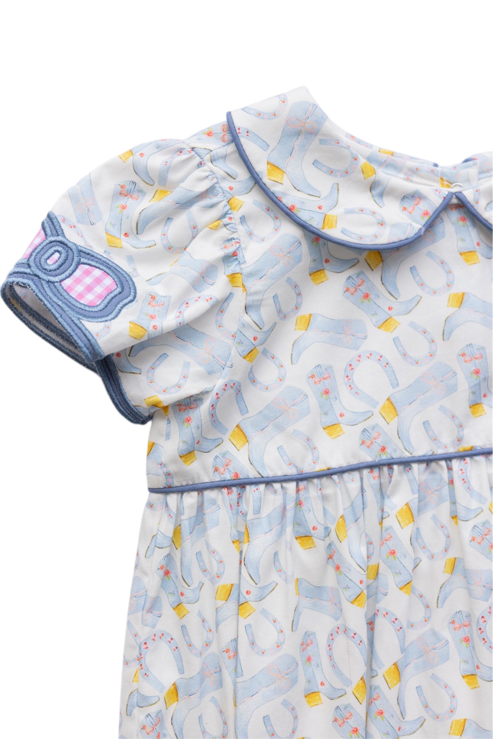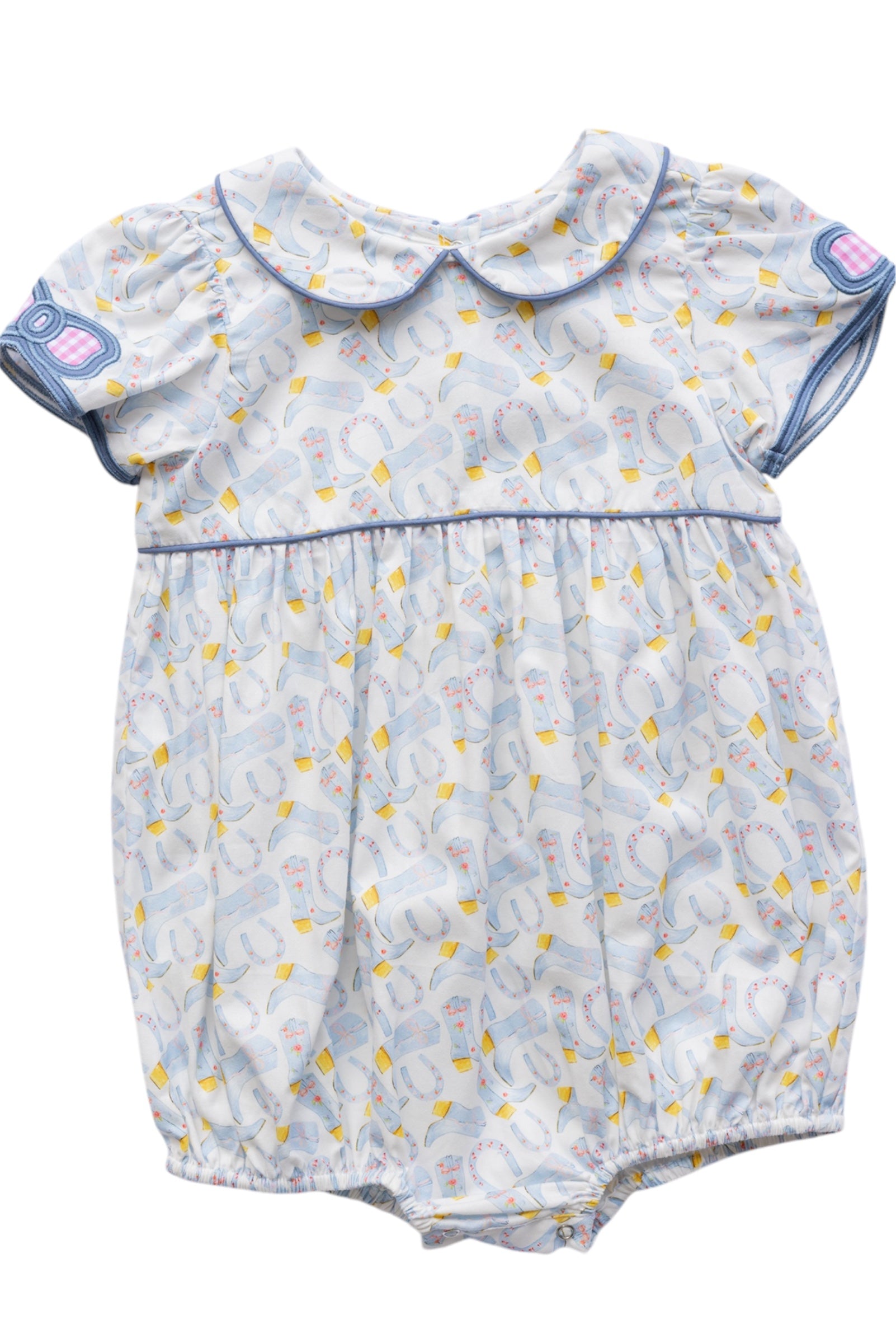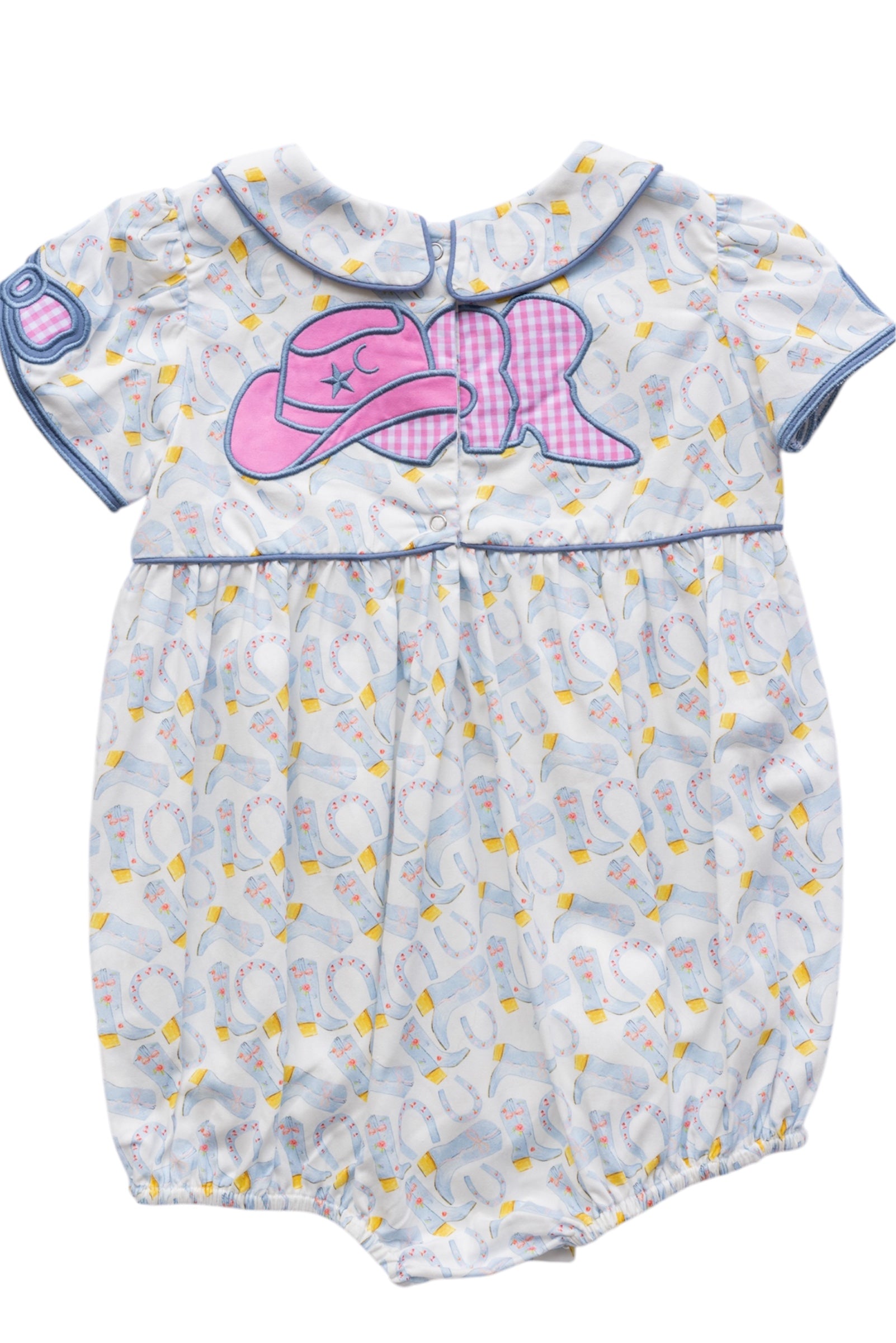 Get ready for your little cowgirl to take on the day in style with our Boots and Bows Bubble! Featuring a charming cowgirl boot print and cute bow appliques on the sleeve and back, this outfit is perfect for any adventure. Made for comfort and cuteness, it's the perfect addition to any little one's wardrobe.