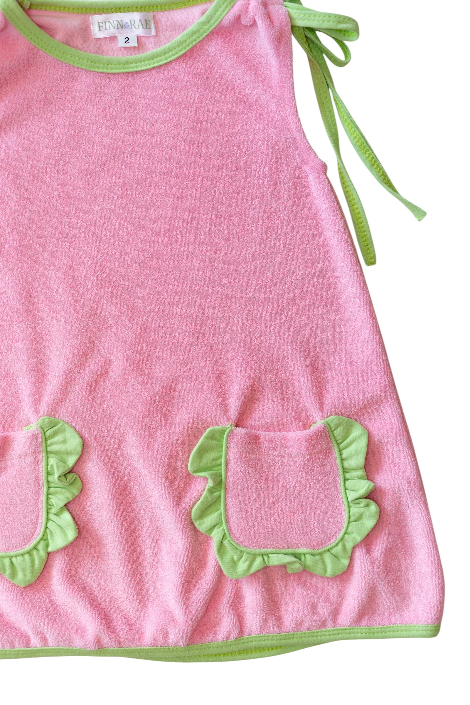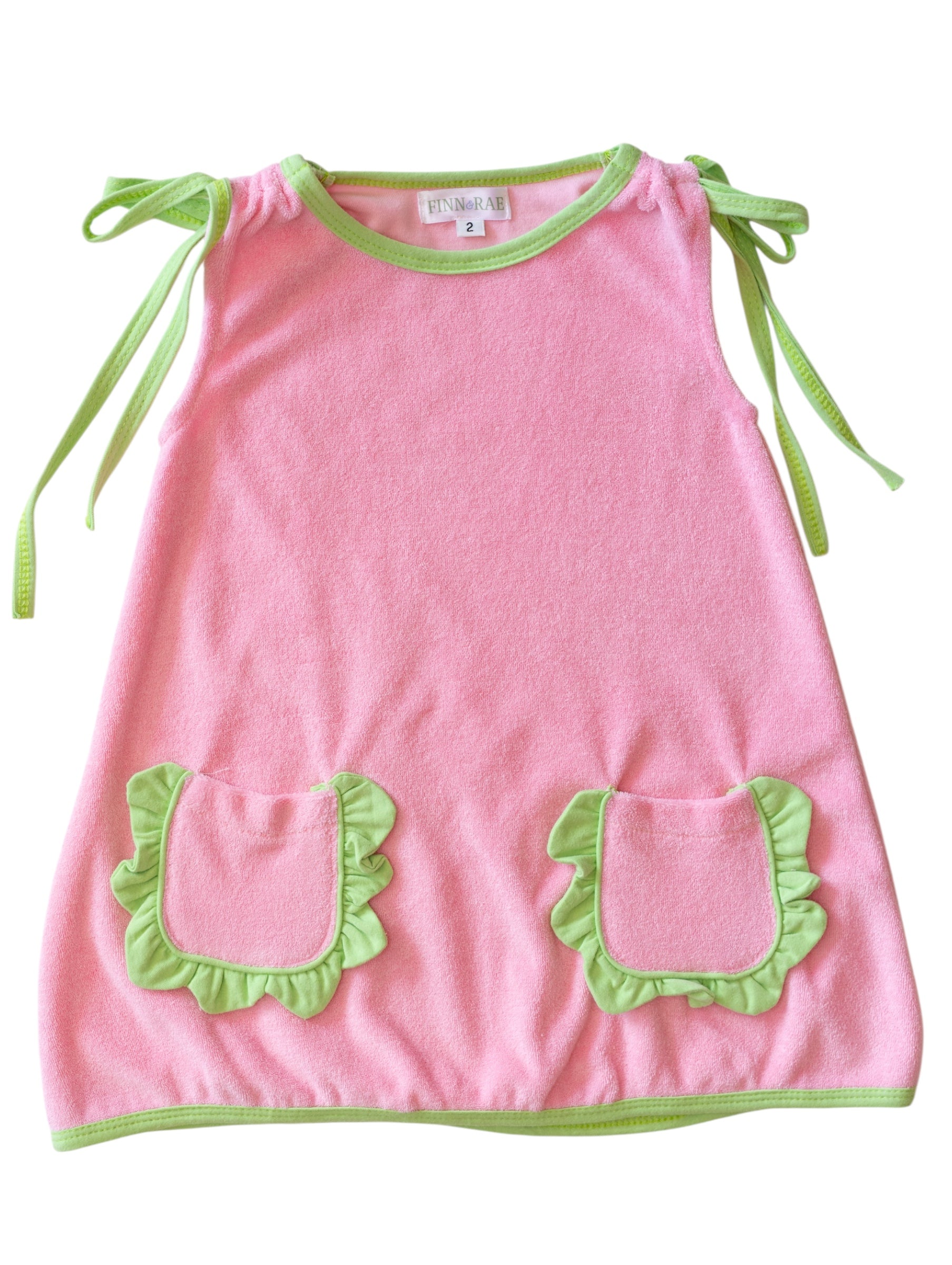 The Breezy Bay Pink French Terry Dress is perfect for your favorite summer activities - from pool days to beach trips. The tide shoulder detail and front pockets with scalloped trim add a touch of cuteness.