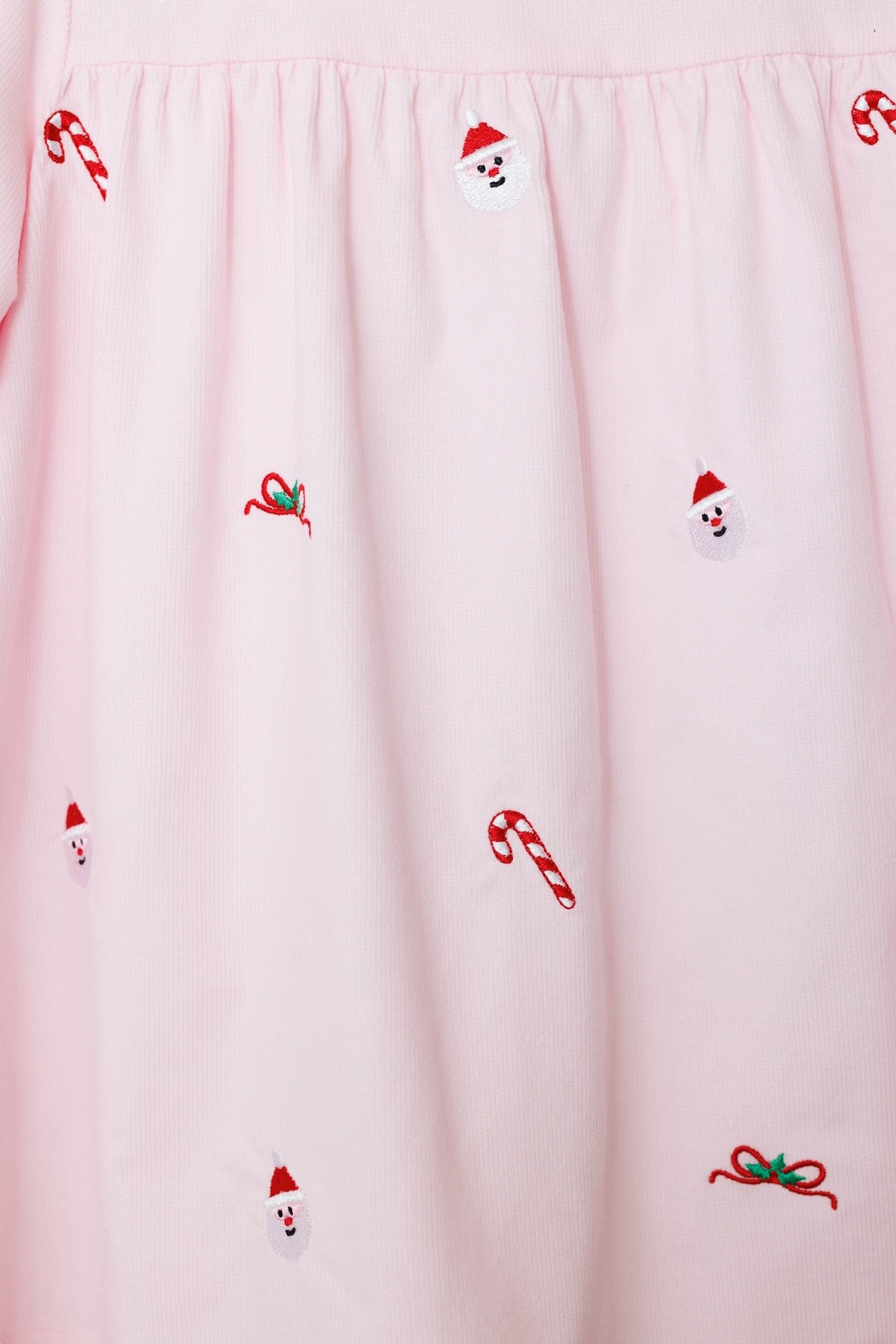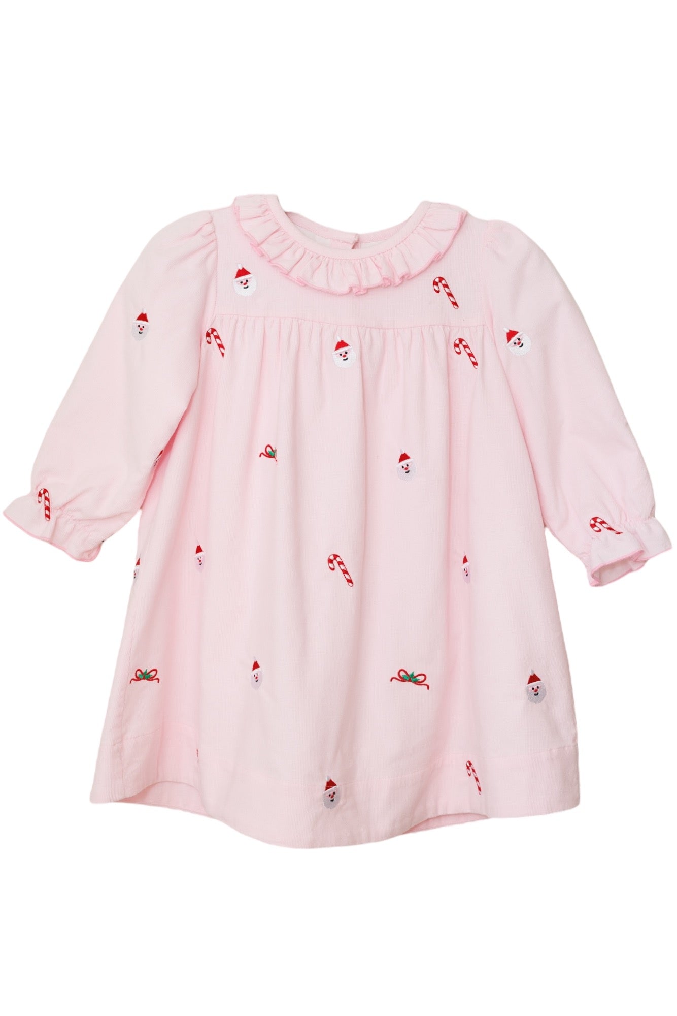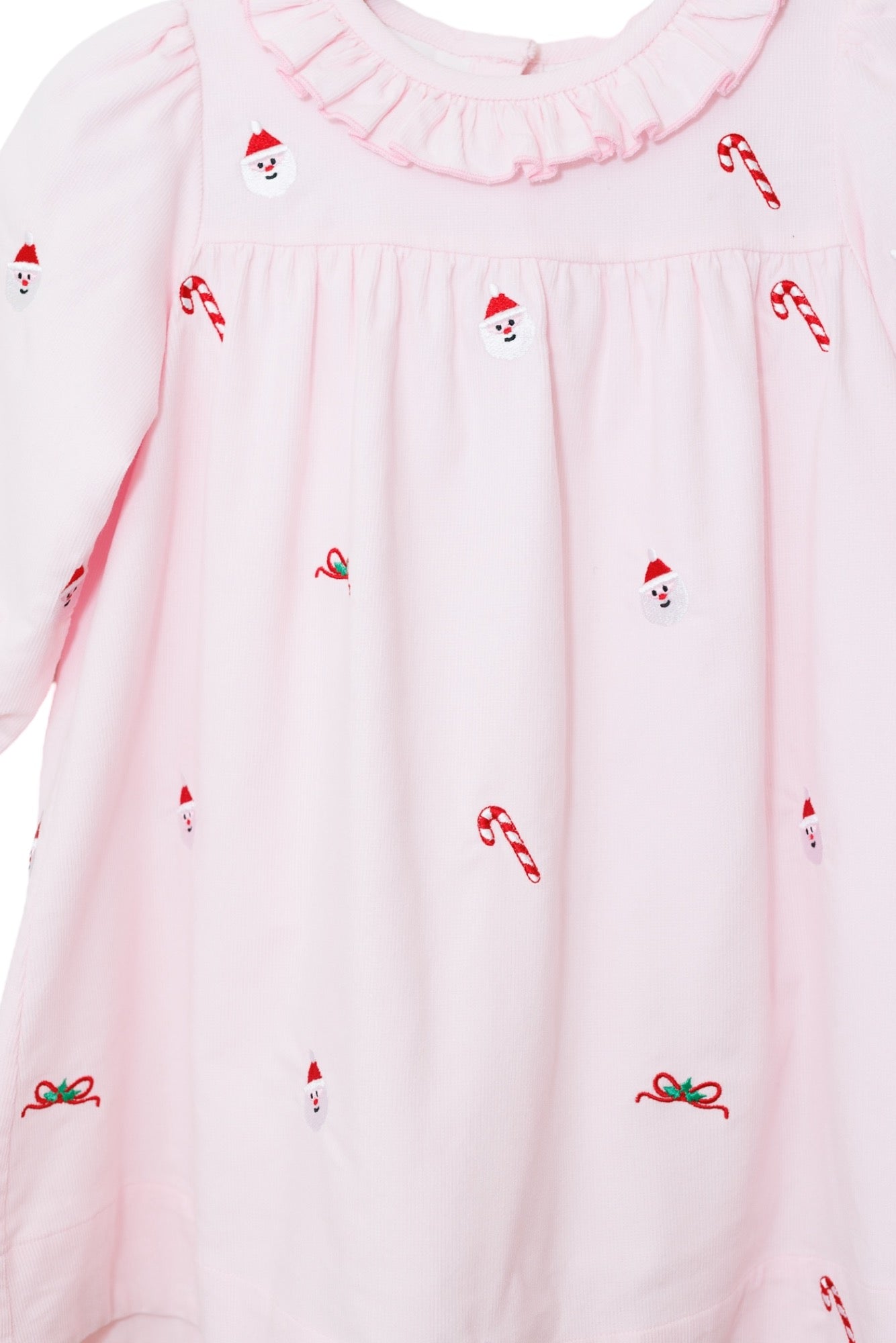 Crafted from luxurious pink velvet cord fabric, this Christmas Embroidery Dress features a beautiful holiday embroidery pattern and a delicate ruffle trim collar. Elevate your holiday wardrobe with this elegant and festive dress. Perfect for any Christmas celebration, this dress is sure to make a statement.