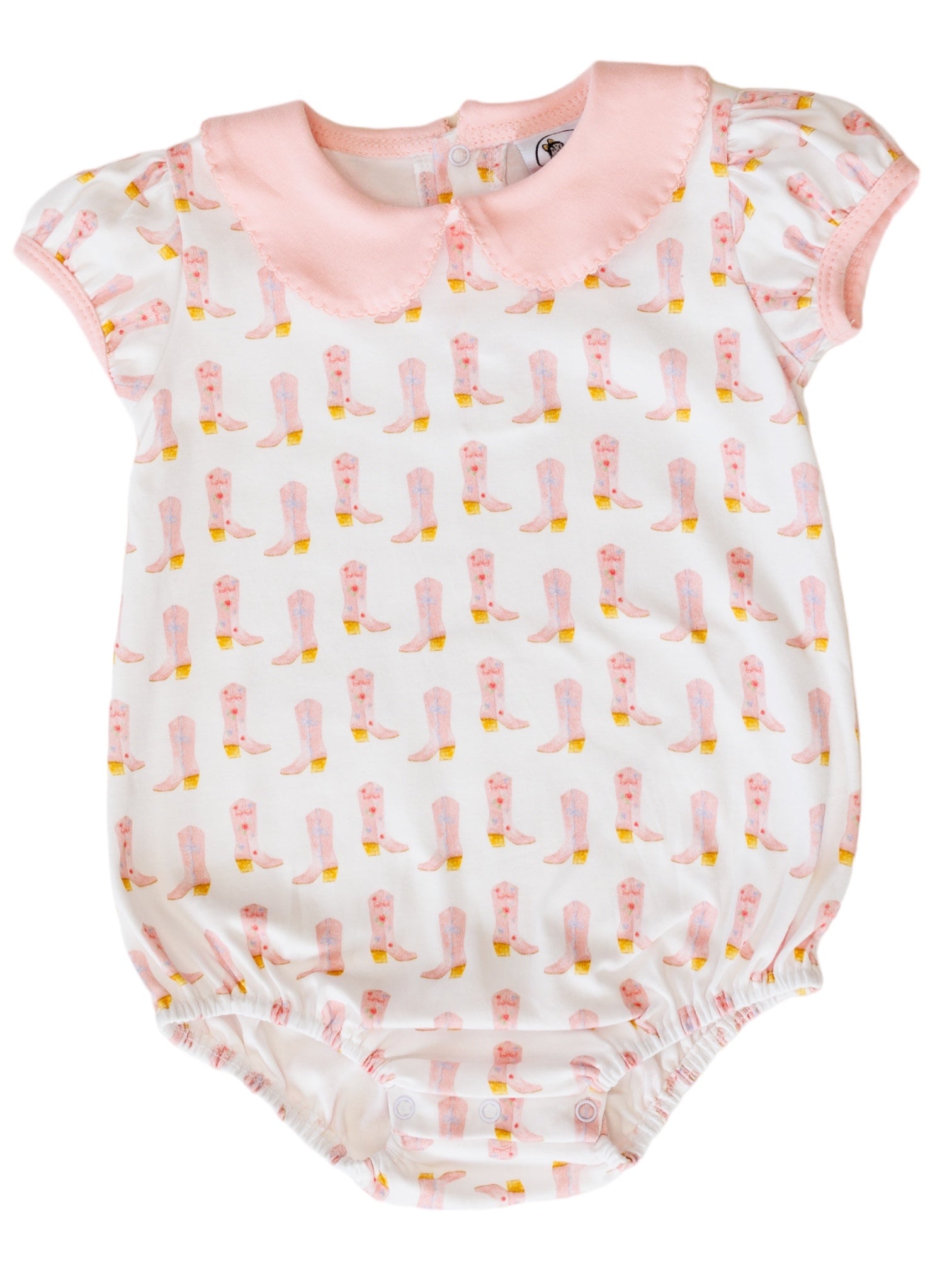 Saddle up for charming adventures with our "Rodeo Rose Cowgirl Boot Onesie" by Finn and Rae Co. This delightful short-sleeve onesie boasts a pristine white canvas adorned with adorable pink cowboy boot prints, capturing the spirit of the wild west in a sweet and stylish ensemble.