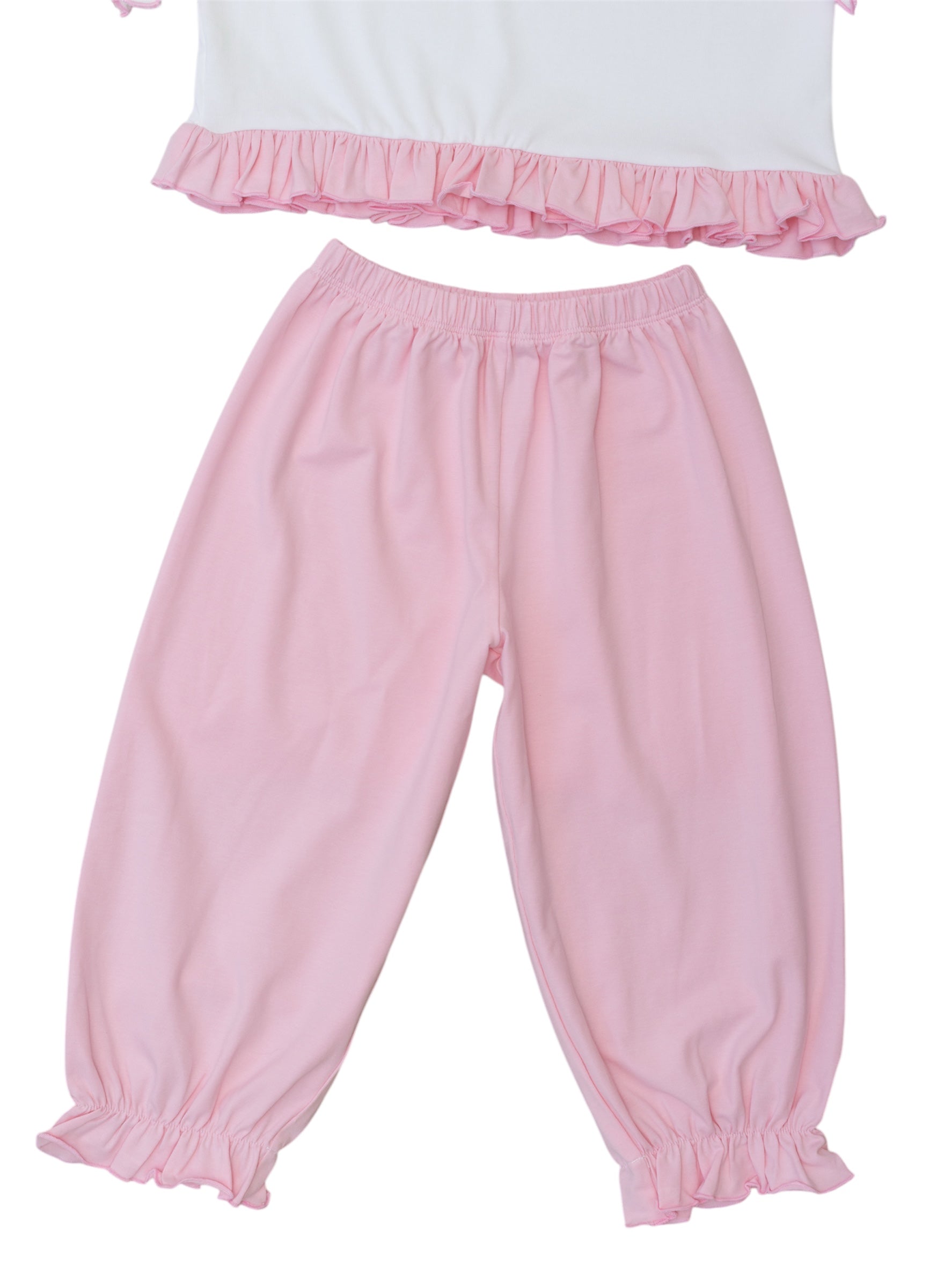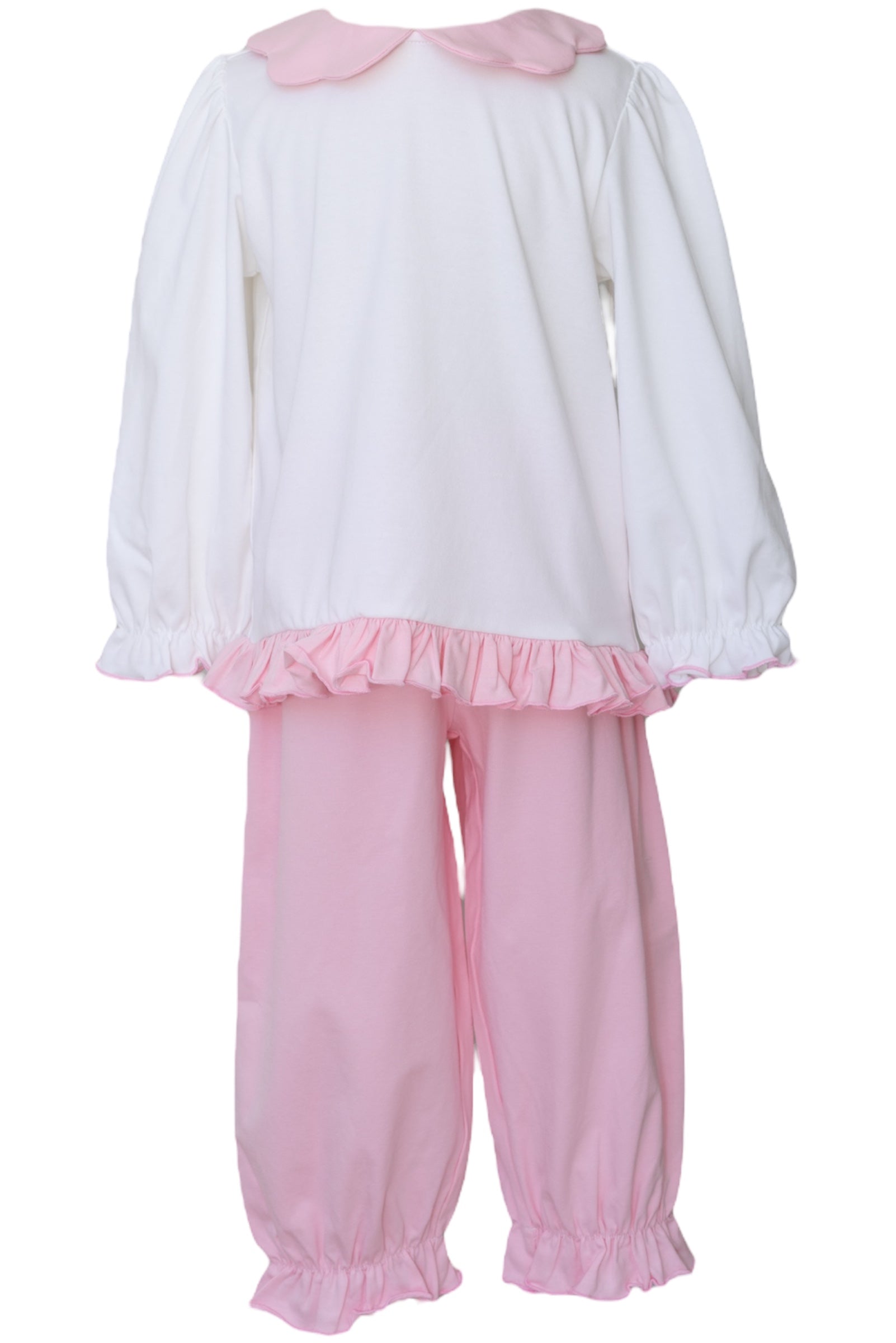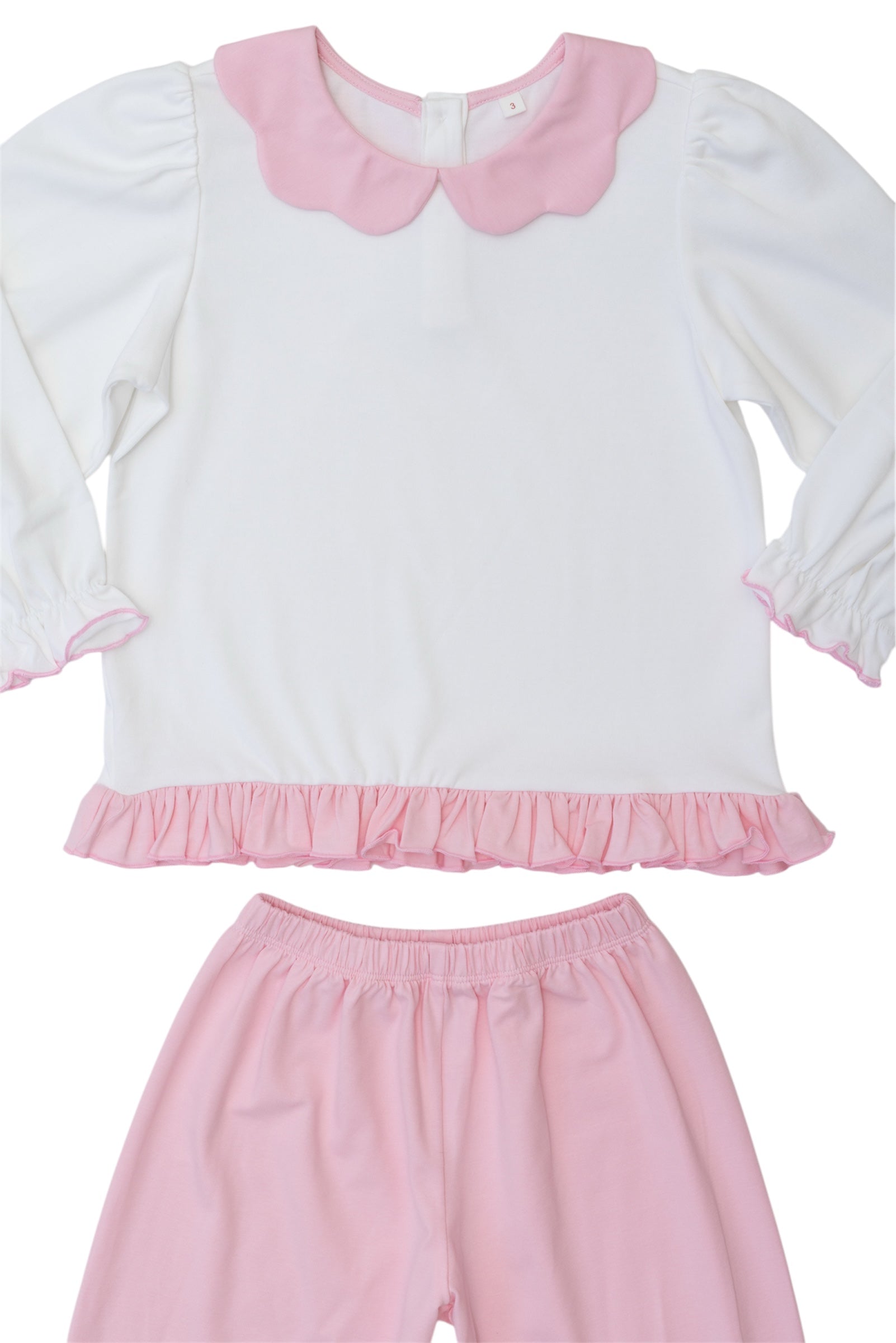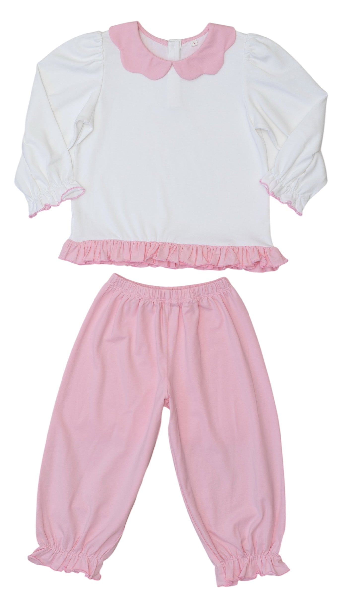 Expertly designed Josie Long Sleeve Pant Set features a unique scallop collar trim and ruffle pant, providing a personal touch for any occasion. Made with high-quality materials, this set offers both comfort and style for a truly versatile and personalized wardrobe staple.