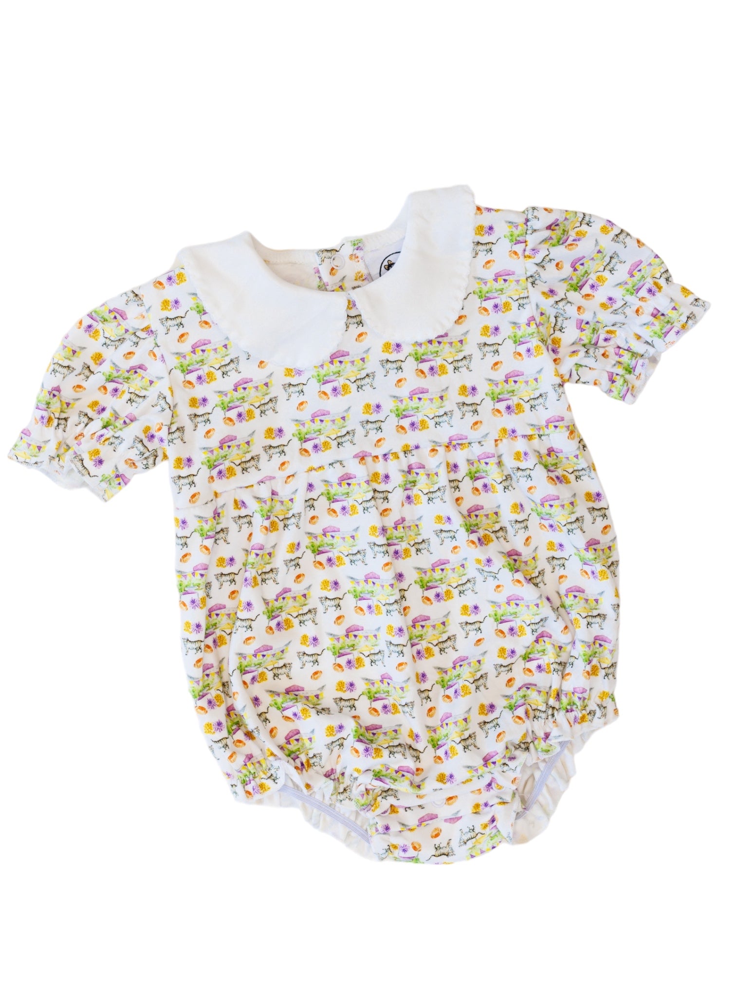 Gear up your little Tiger fan for game day with our "Tiger Touchdown Stadium Collar Bubble" by Finn and Rae Co. This spirited one-piece ensemble is not just an outfit; it's a celebration of LSU pride. The white background features a repeated stadium design created by Sibley Designs, adding a unique and playful touch to your little one's game day attire.