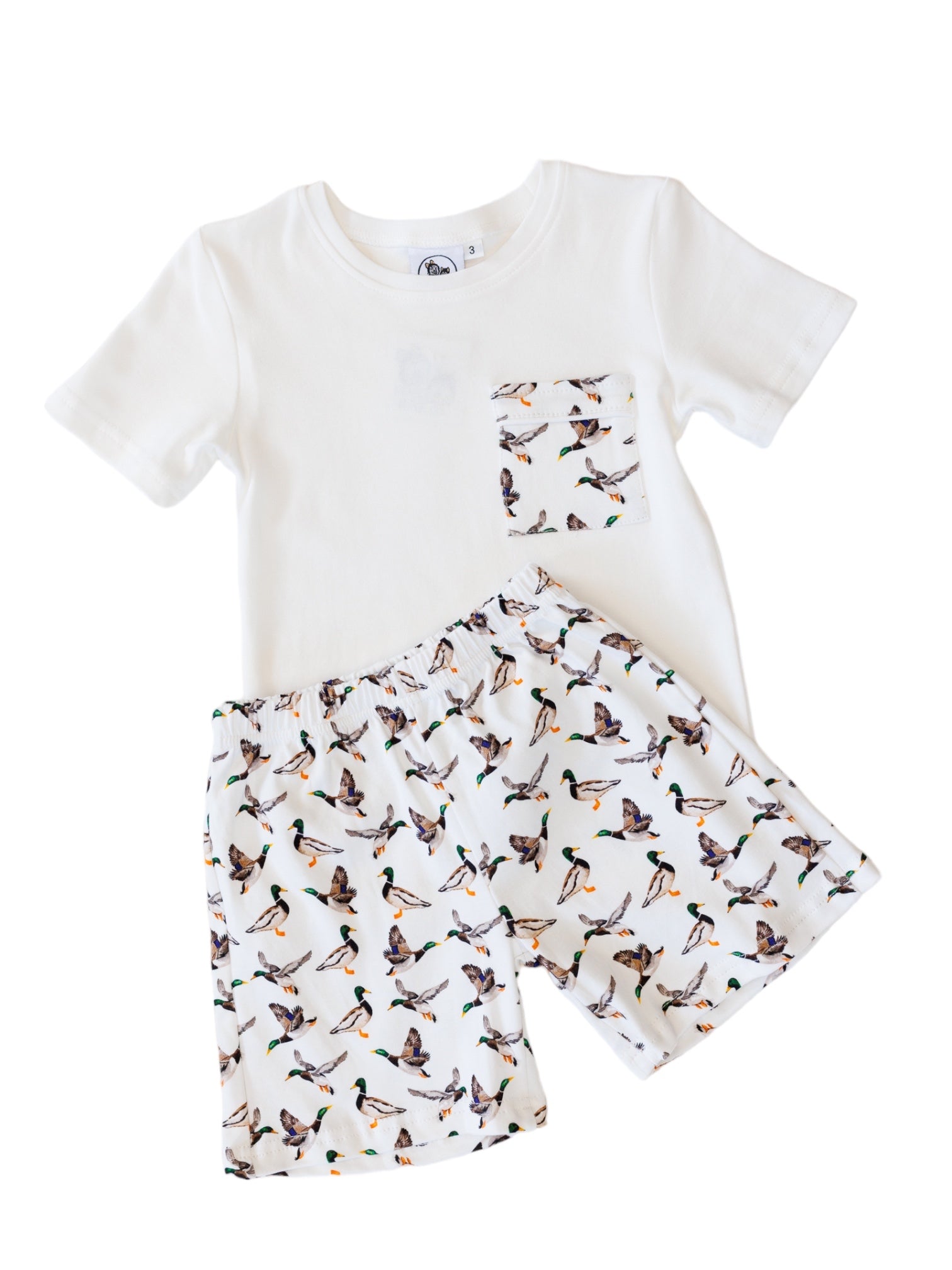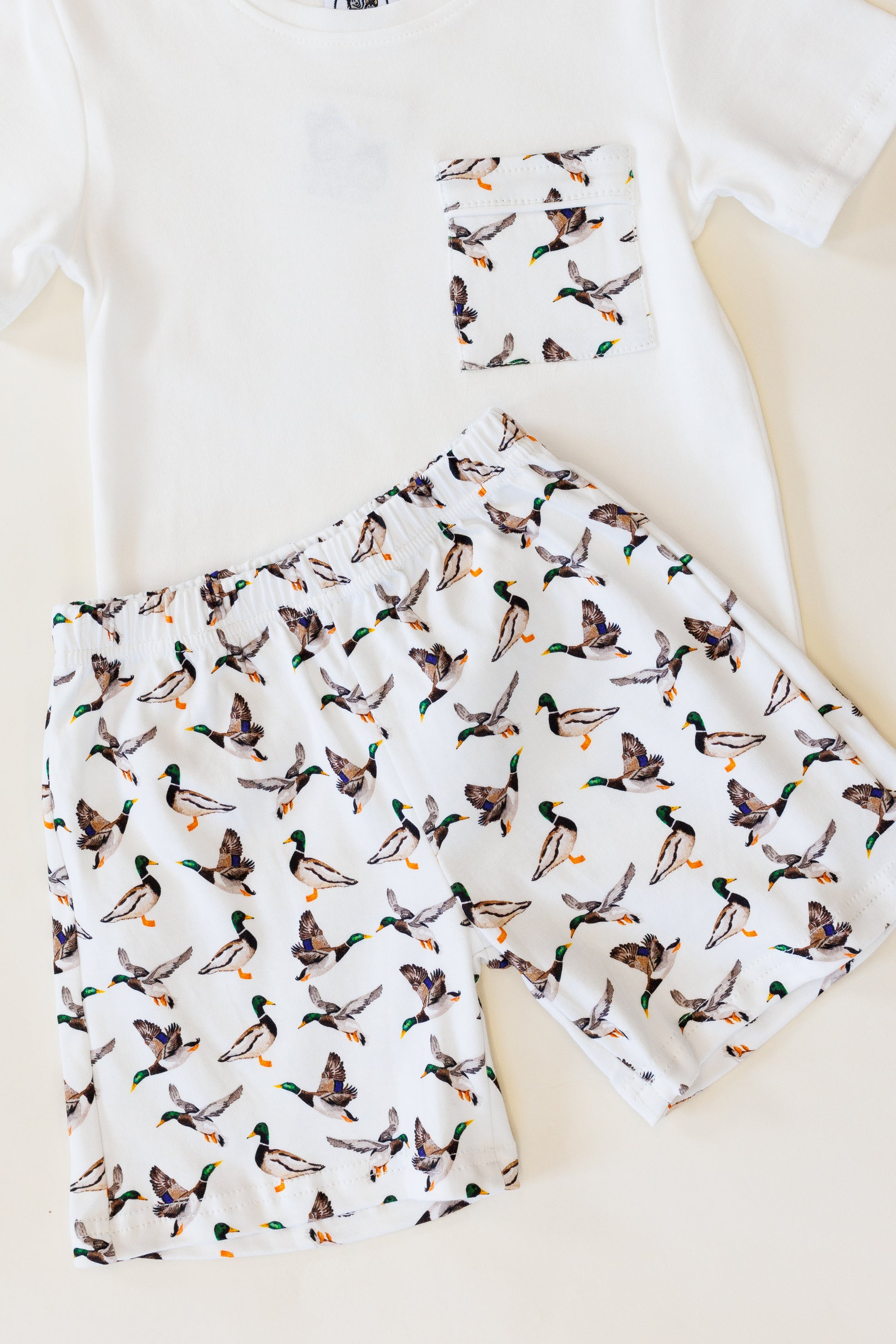 Crafted for both comfort and charm, the white tee with a printed pocket adds a touch of sophistication, while the mallard print brings outdoor whimsy to the forefront. The coordinating shorts complete the ensemble, ensuring your little one is ready for playdates, family gatherings, or simply adding a dash of charm to their wardrobe.