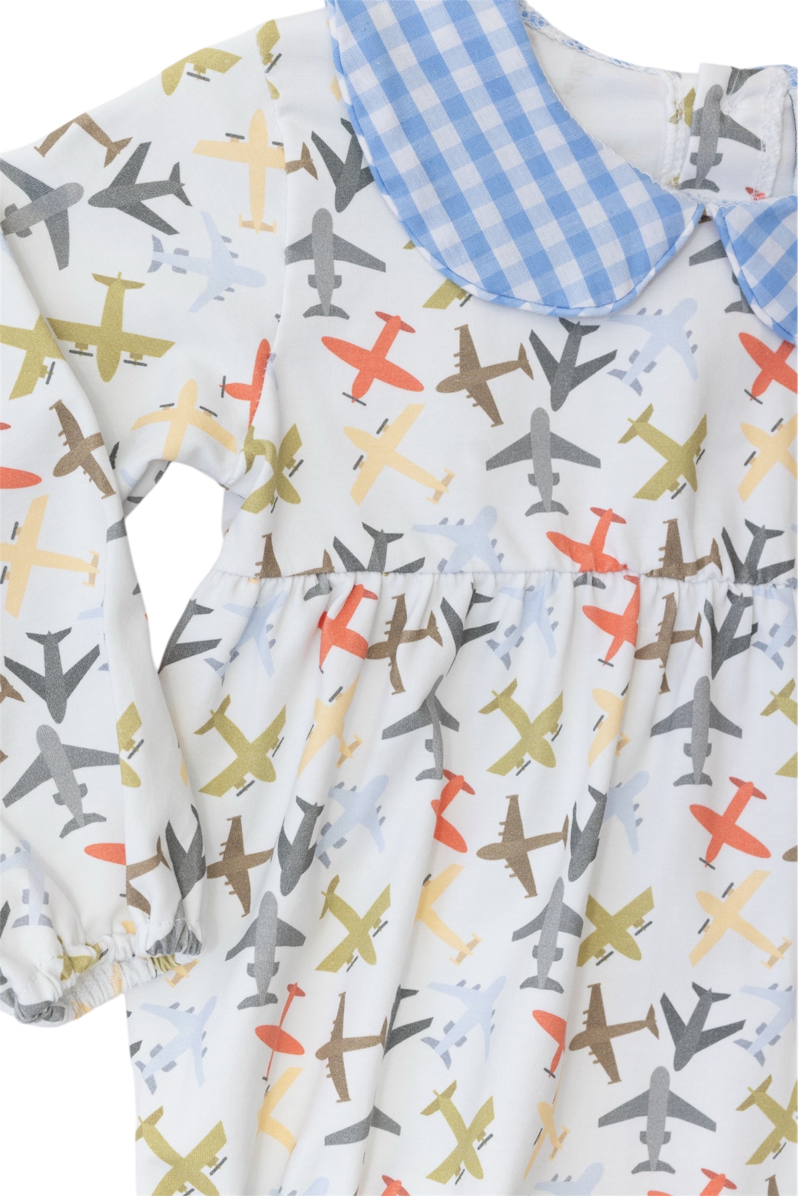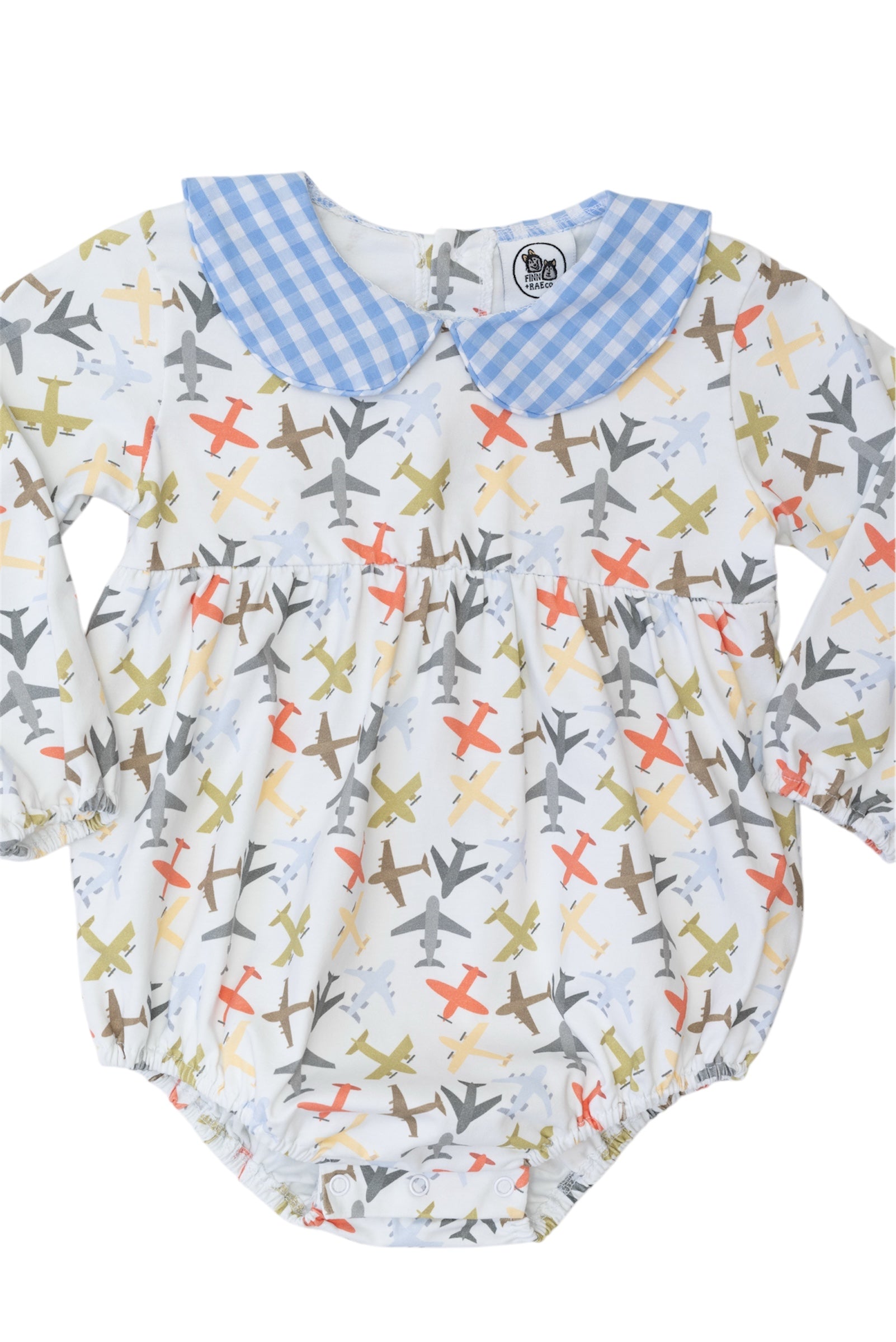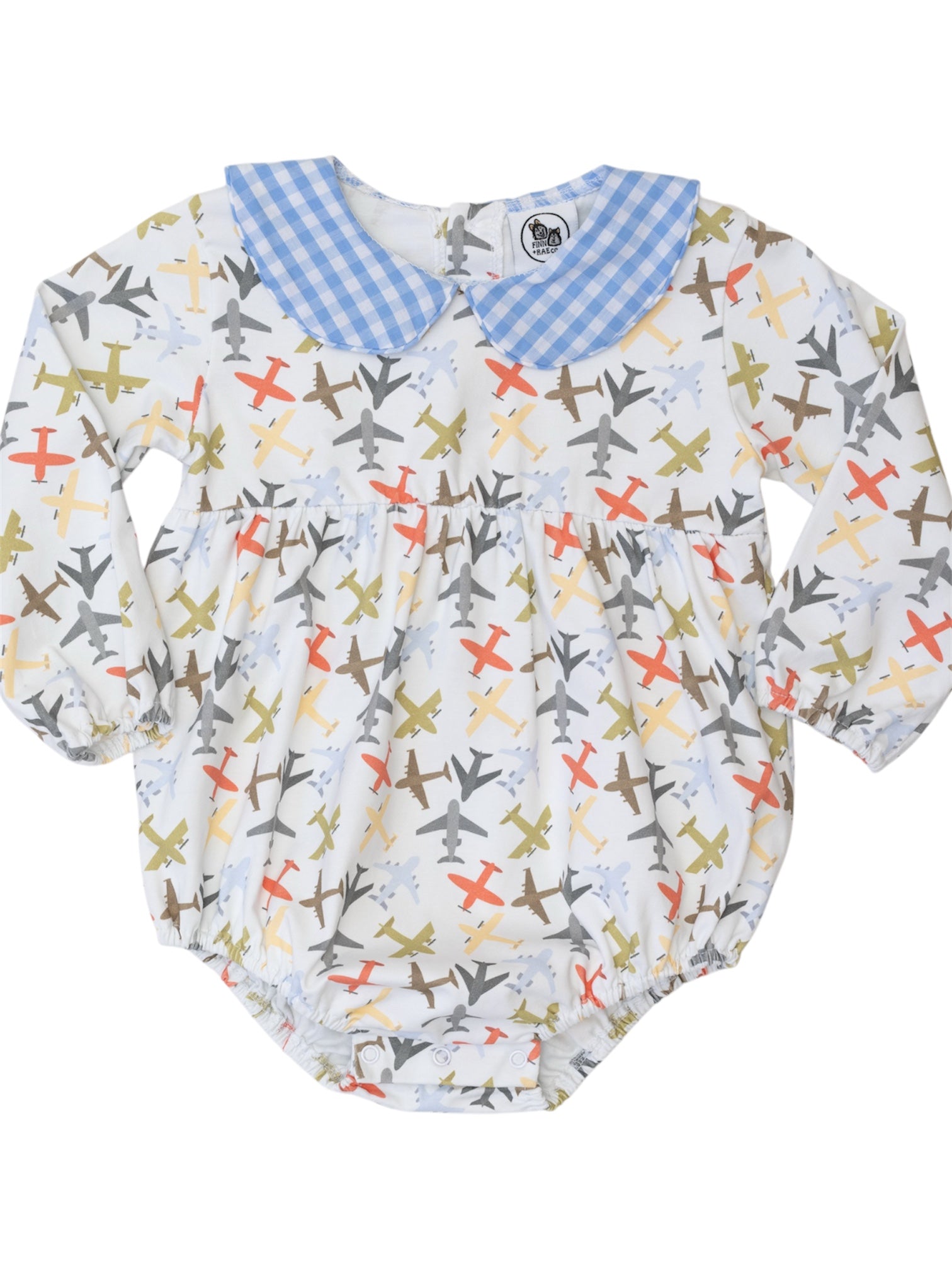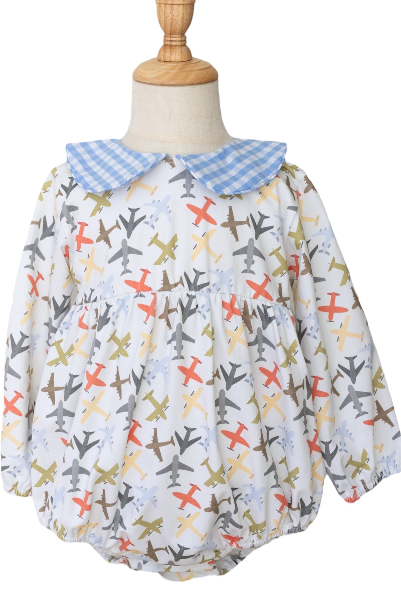 This long sleeve bubble features a playful airplane print, perfect for your little one's wardrobe. The soft fabric ensures comfort while the long sleeves provide warmth. Add a touch of fun to your child's outfit while keeping them cozy in this adorable piece.