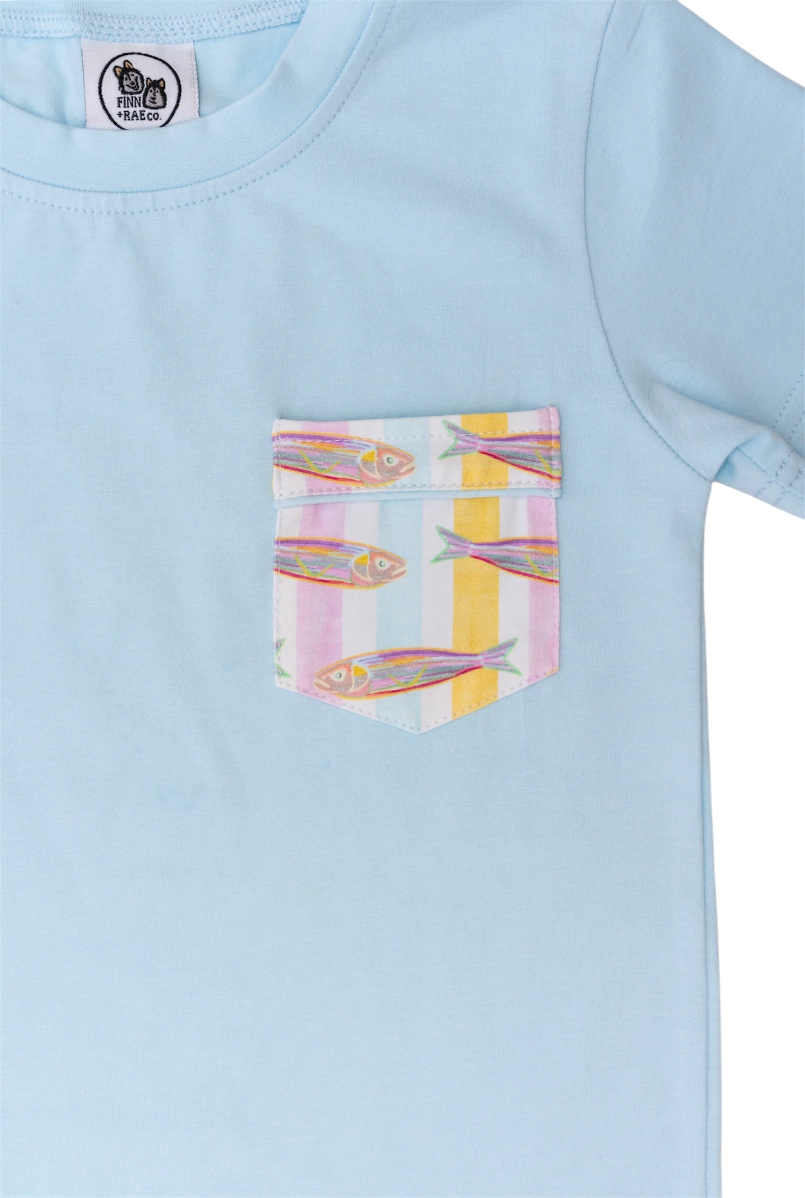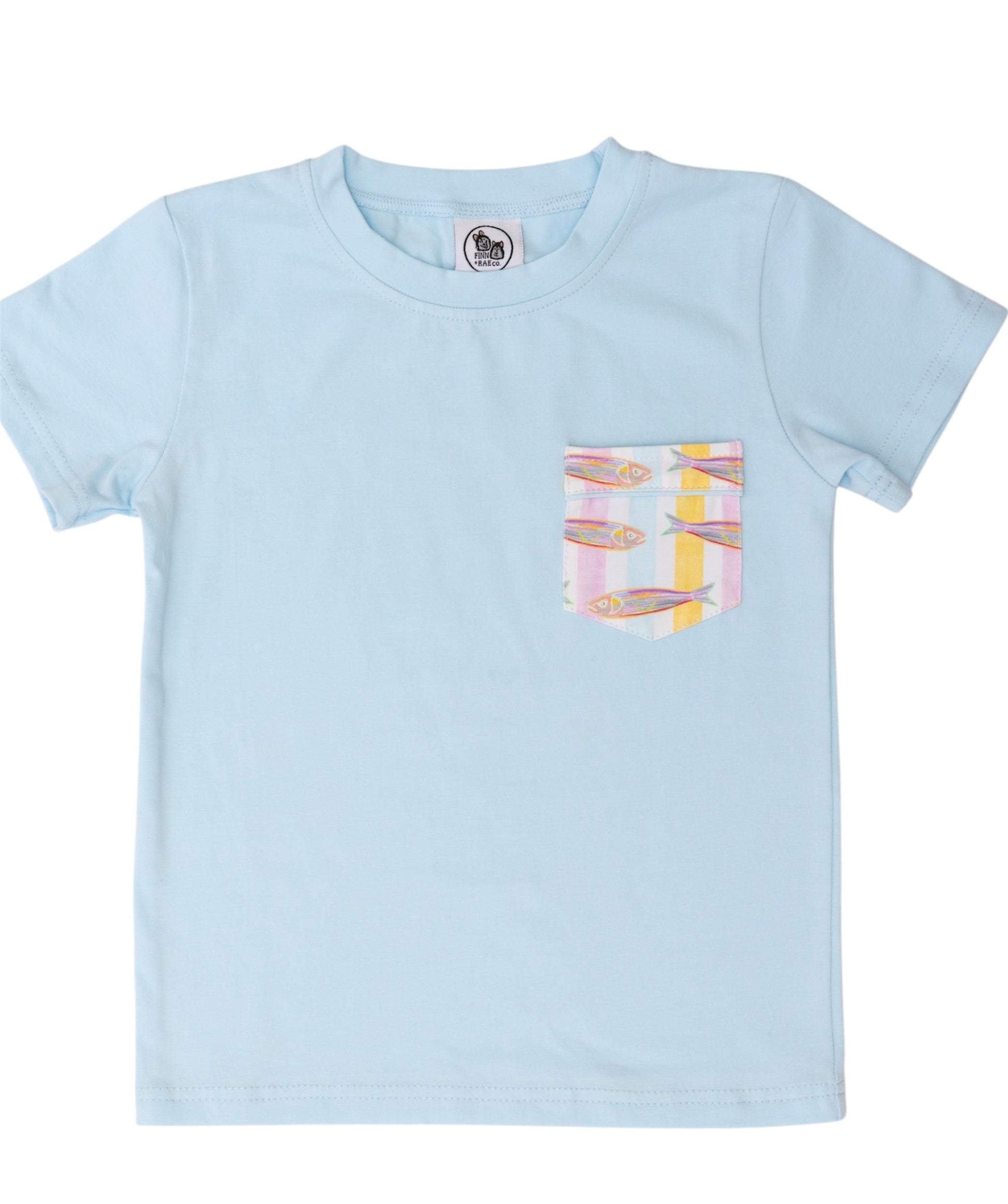 Introducing the Seas the Day Pocket Tee. A custom collab between Finn & Rae and LALA VIED, this ultra soft cotton t-shirt features a unique pocket design that matches the boys swim shorts in this collection. Comfort and style meet in this must-have piece.