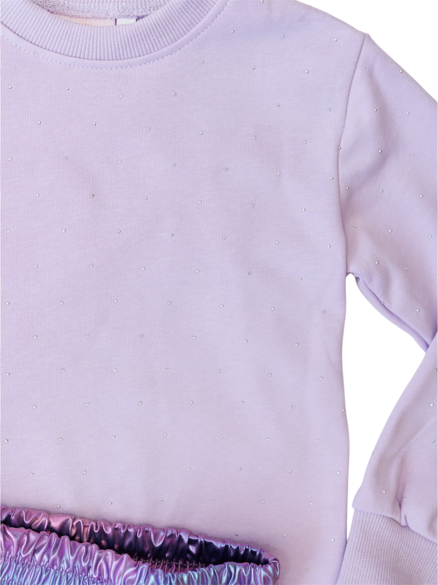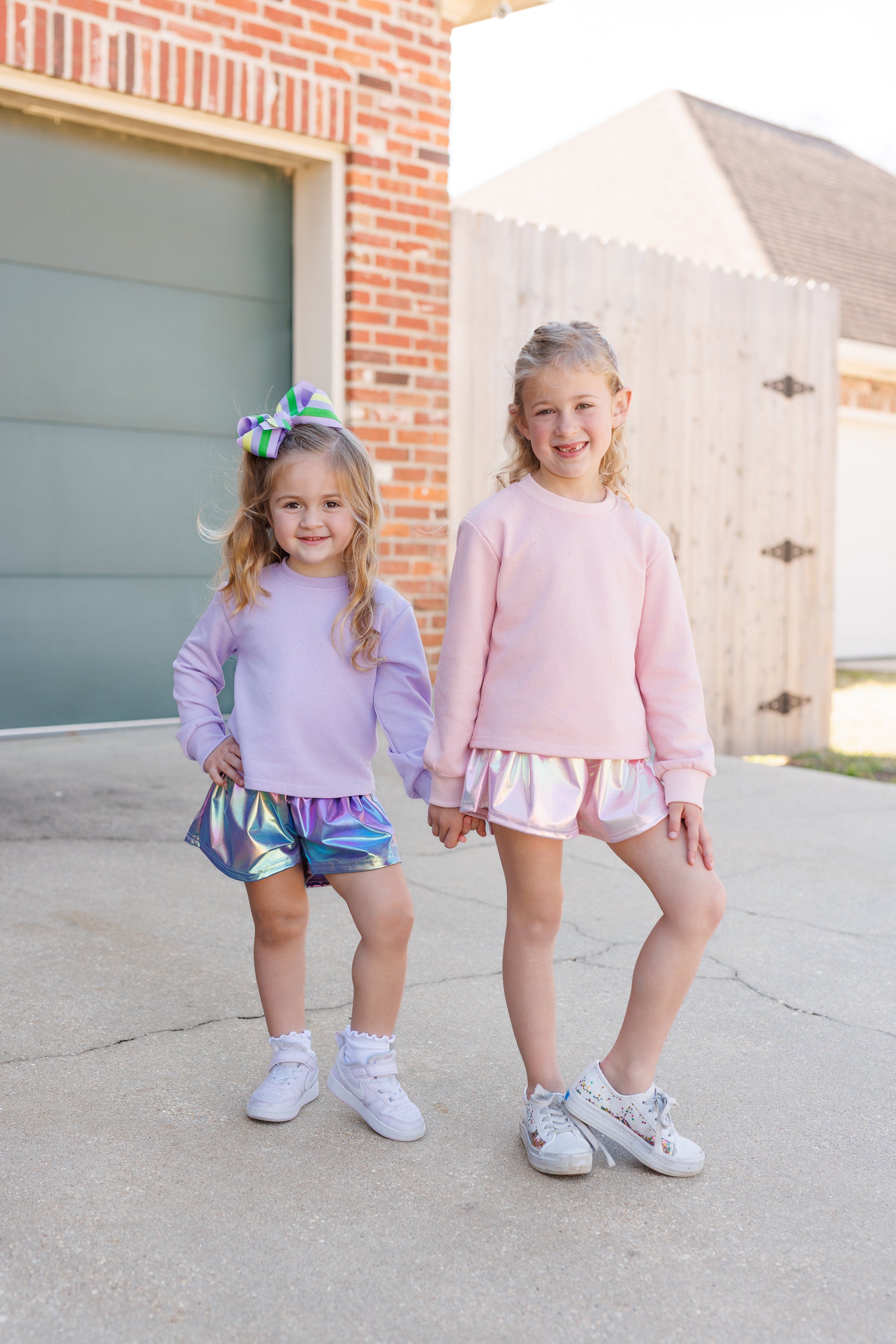 Shine bright in the Showtime Shimmer Short Set! This eye-catching ensemble features a rhinestone-embellished top paired with shimmering shorts that catch the light from every angle. Built-in athletic biker short liners keep you comfortable and secure, whether you're dancing at parties, cheering on gameday, celebrating Mardi Gras, or just living your best everyday life. Sparkle with confidence in a set that's as versatile as it is dazzling.