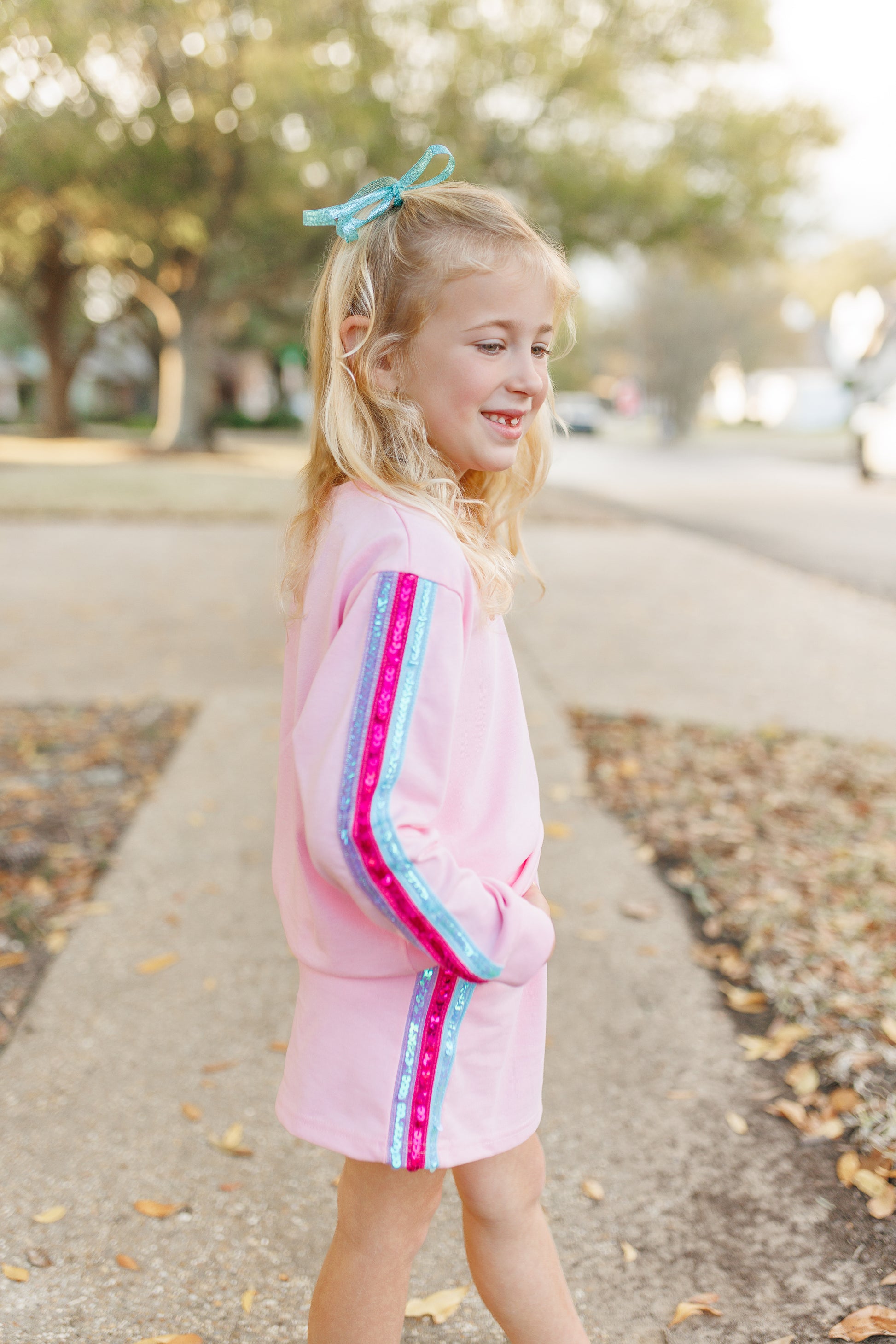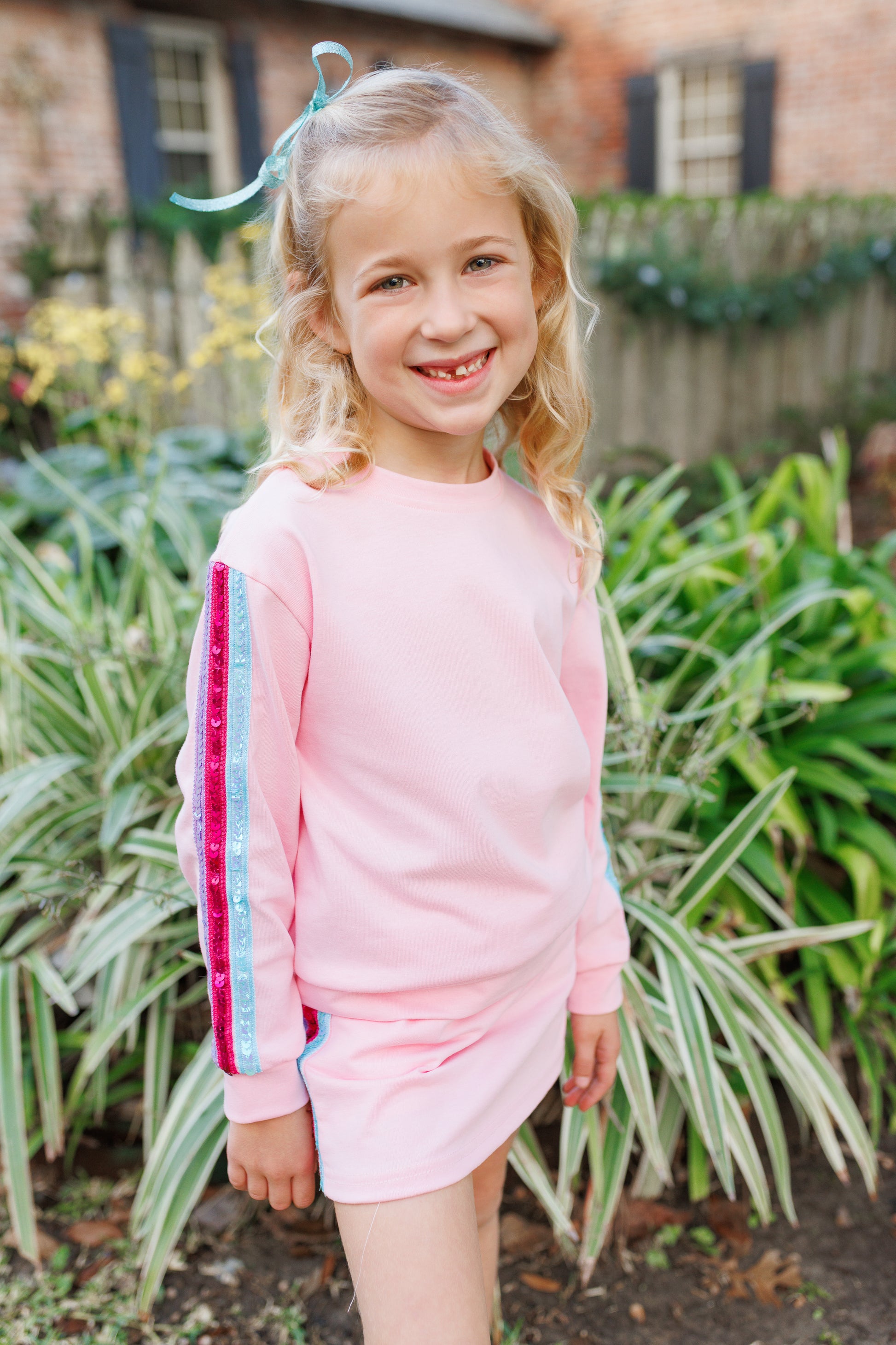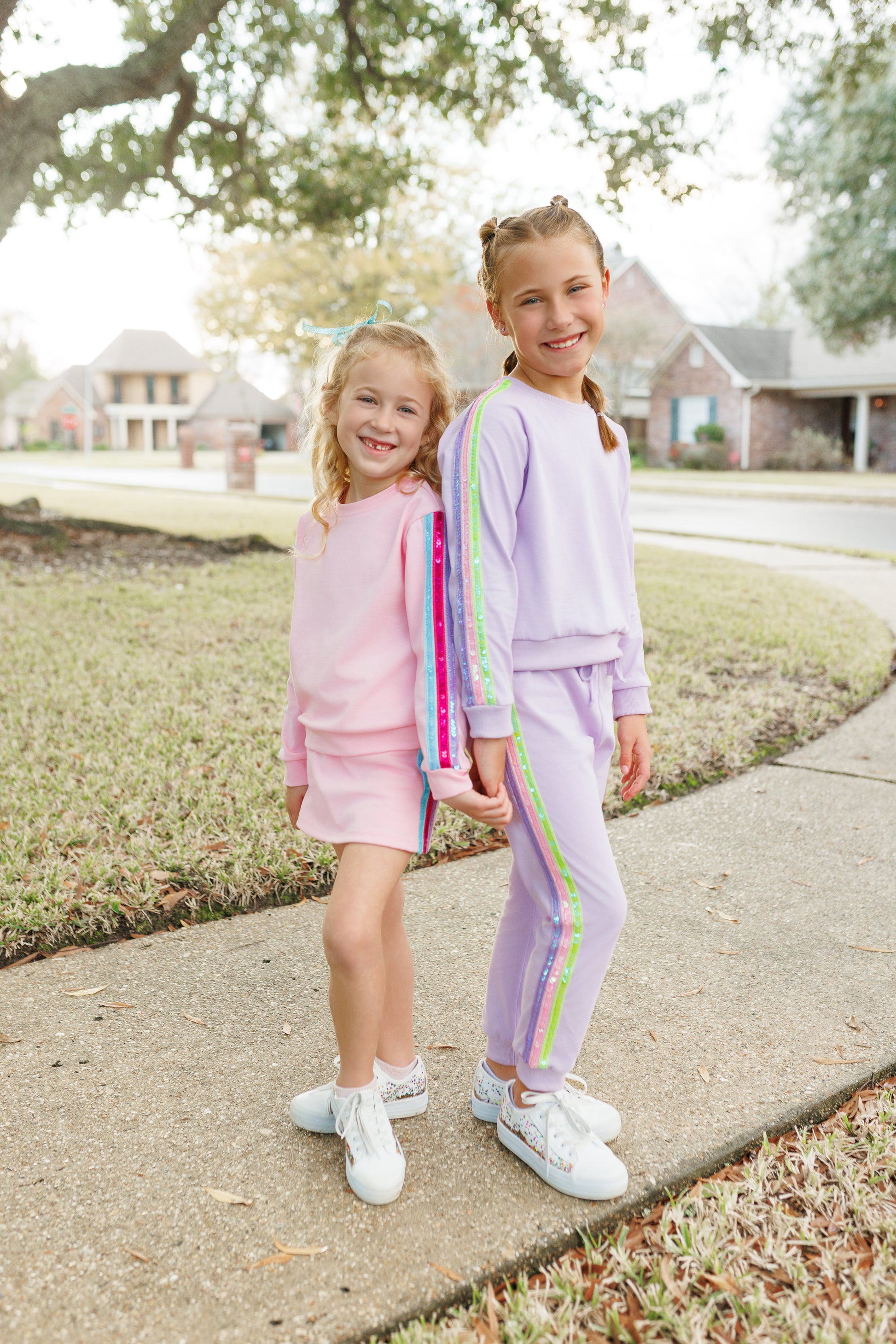 Our Twirl & Shine Sequin Skirt Set is the perfect blend of fun and function for girls who love a little sparkle. Designed with eye-catching sequin side stripes and a playful silhouette, this set brings standout style to everyday wear and special moments alike.