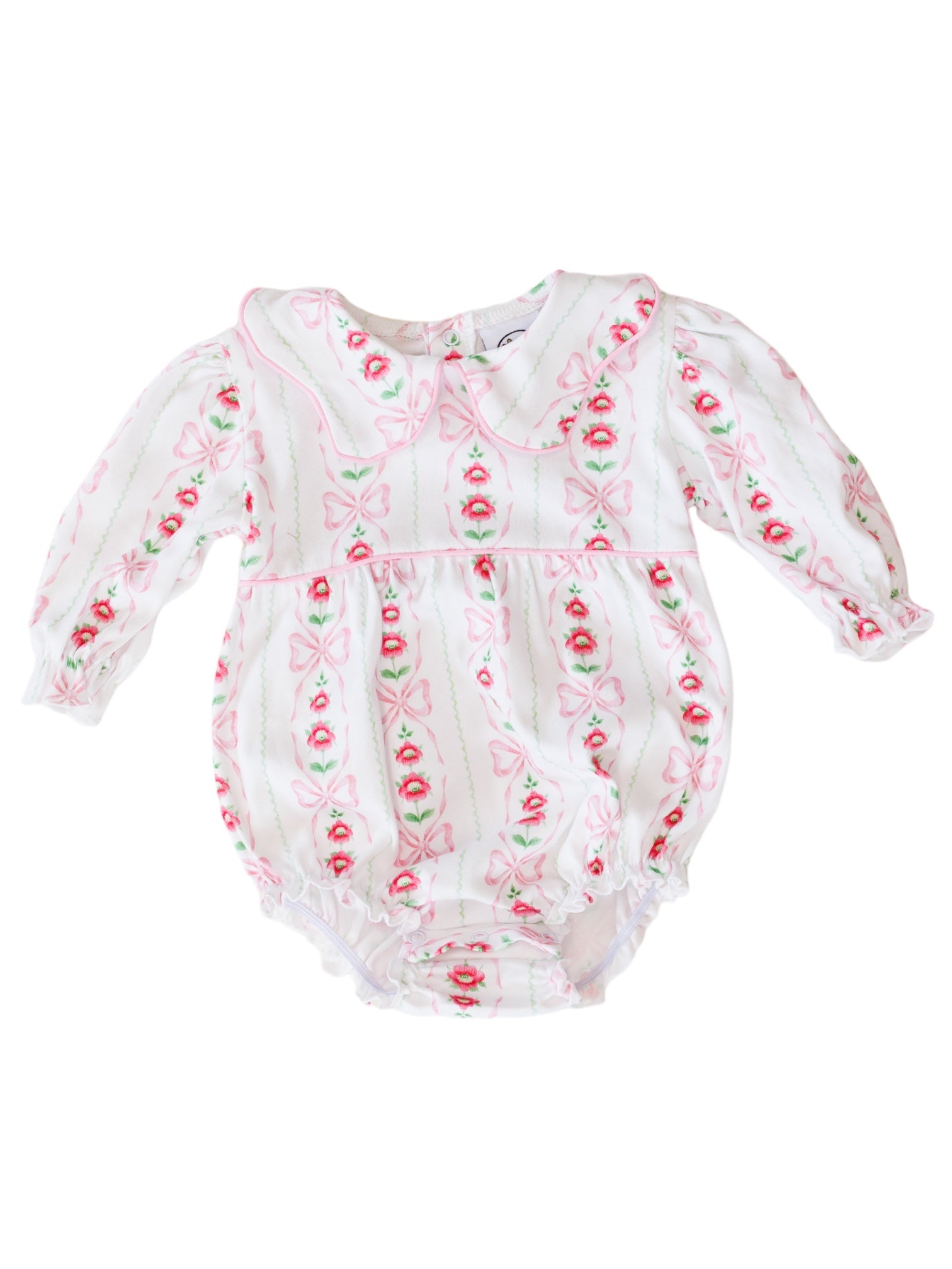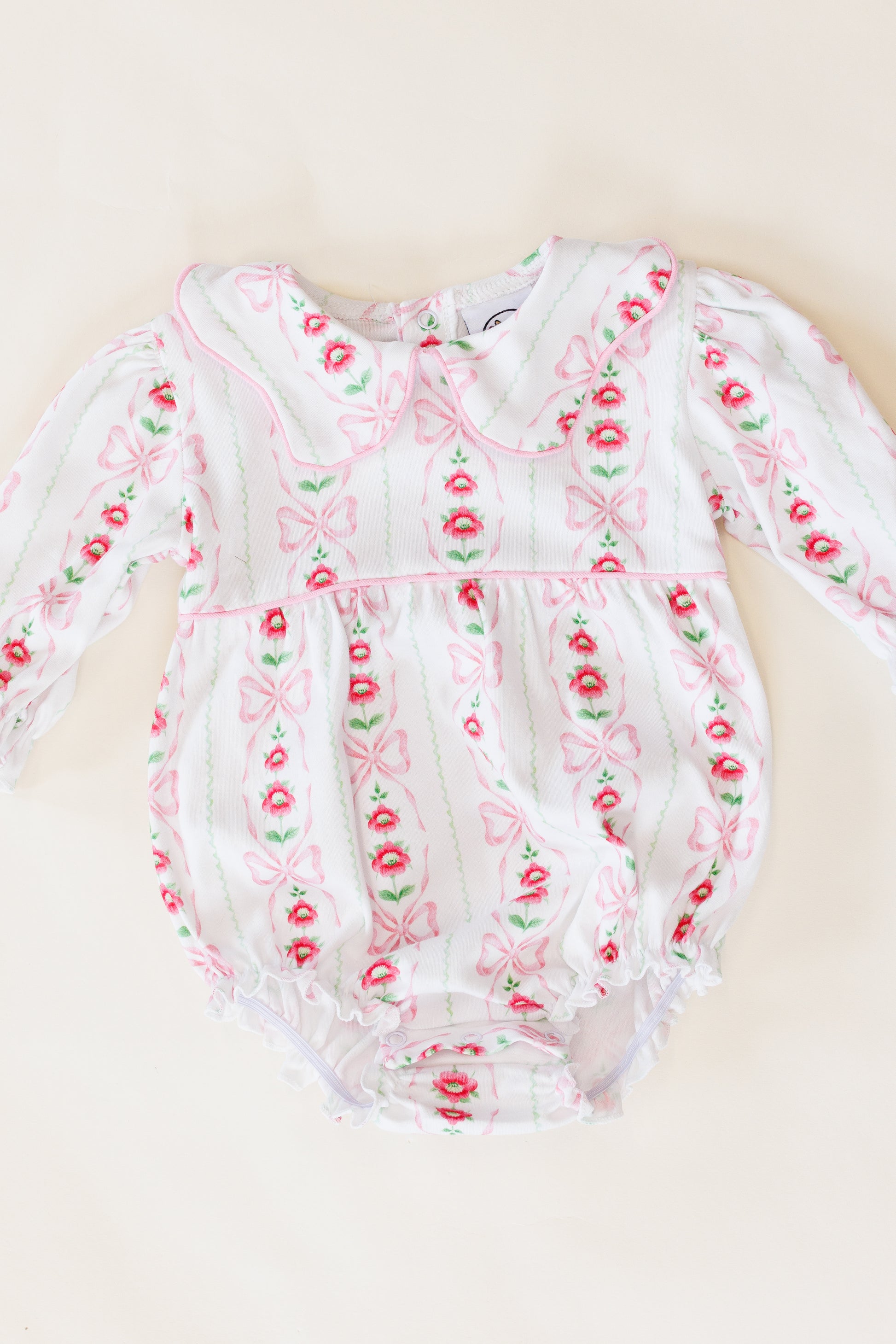 Elevate your little one's wardrobe with our "Blossom Bow Floral Long Sleeve Bubble" by Finn and Rae Co. This enchanting bubble features the captivating bow and floral print, creating a coordinated and whimsical ensemble perfect for all seasons. The bubble is designed with long sleeves and a charming scalloped collar, adding a touch of timeless elegance to your child's attire.