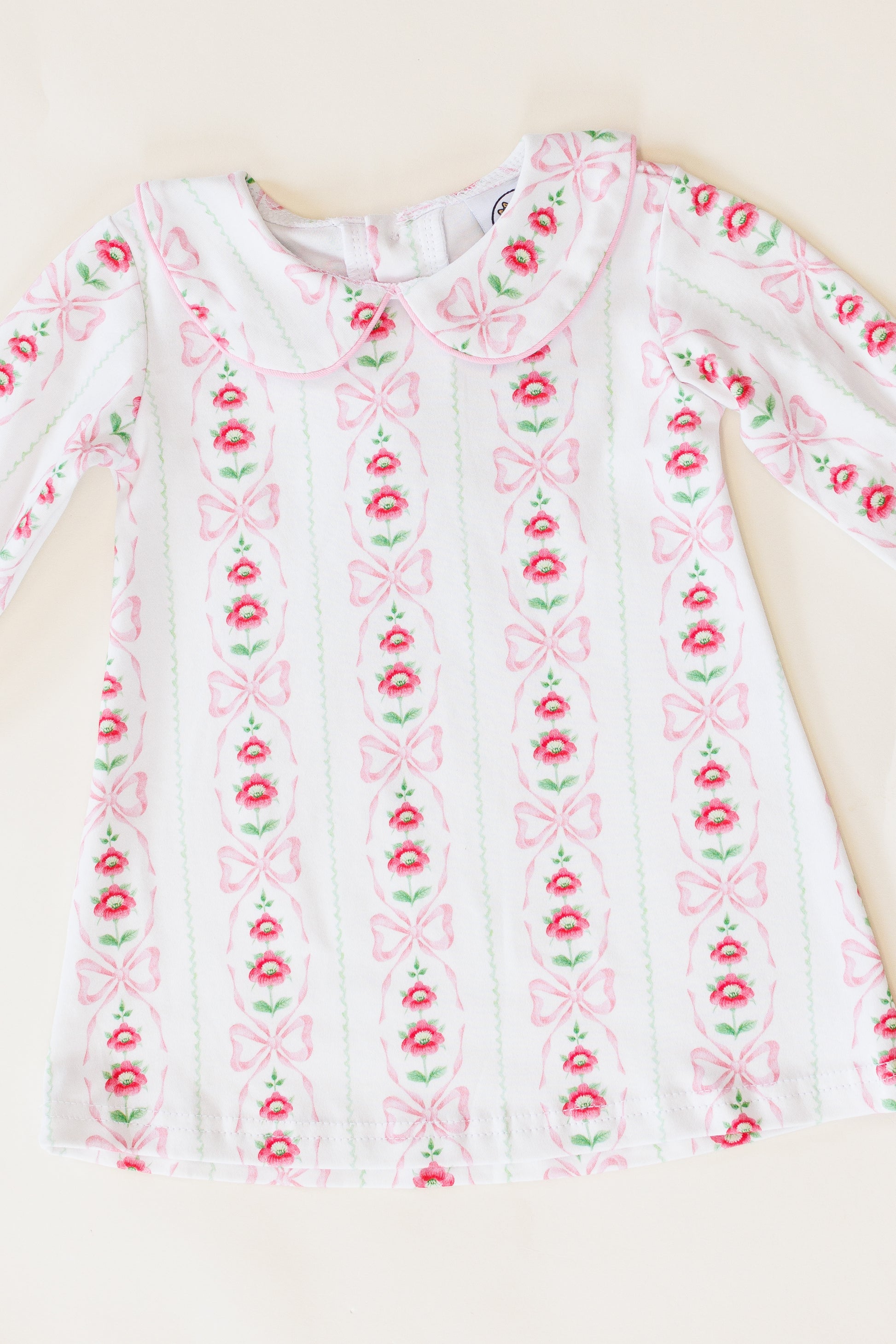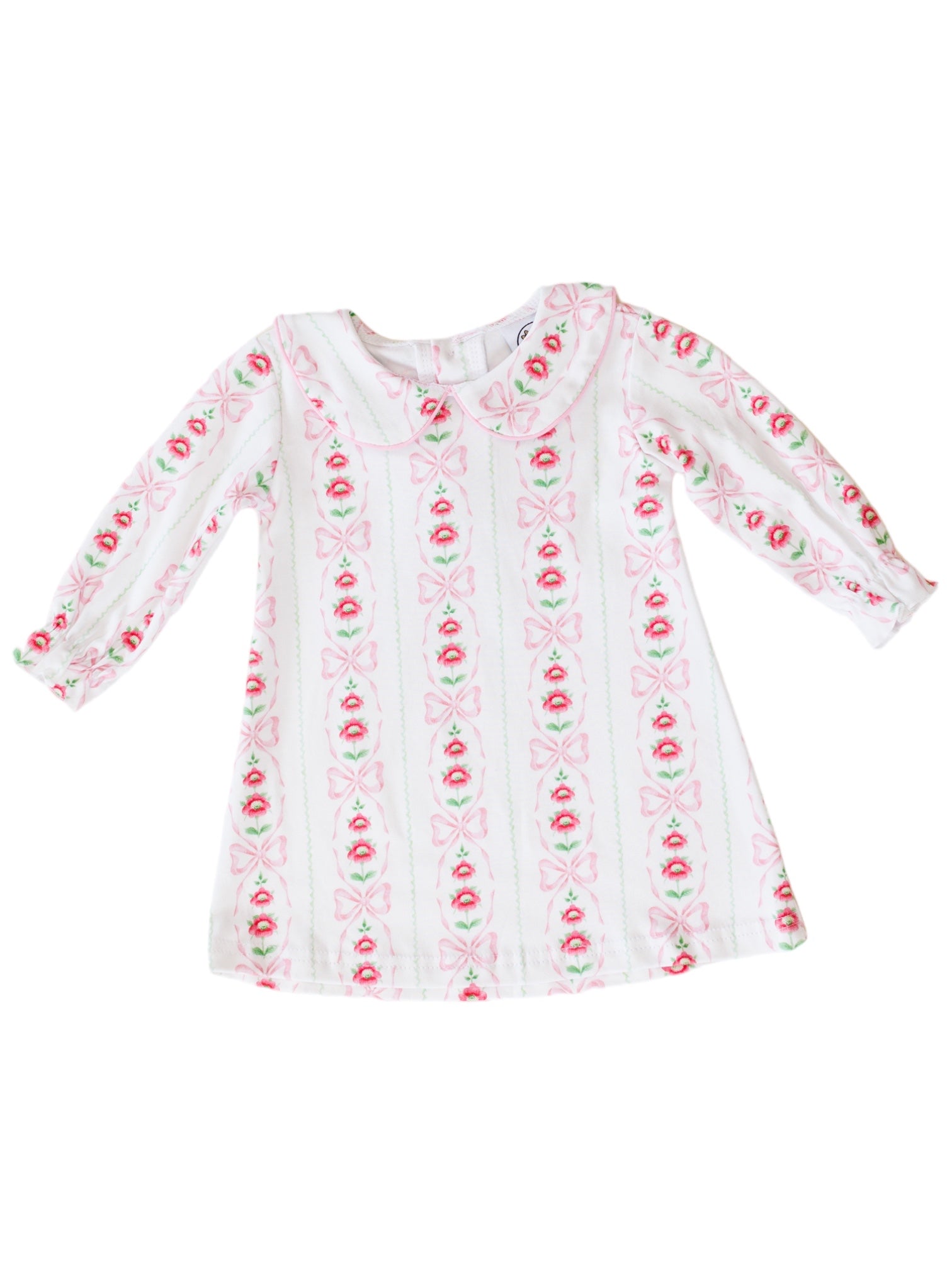 Crafted for comfort and style, the bow-inspired print captures the magic of the season, making this dress perfect for festive gatherings, family photos, or any occasion where a dash of charm is needed. The long sleeves ensure warmth during chilly days, while the Peter Pan collar adds a sweet and sophisticated touch.